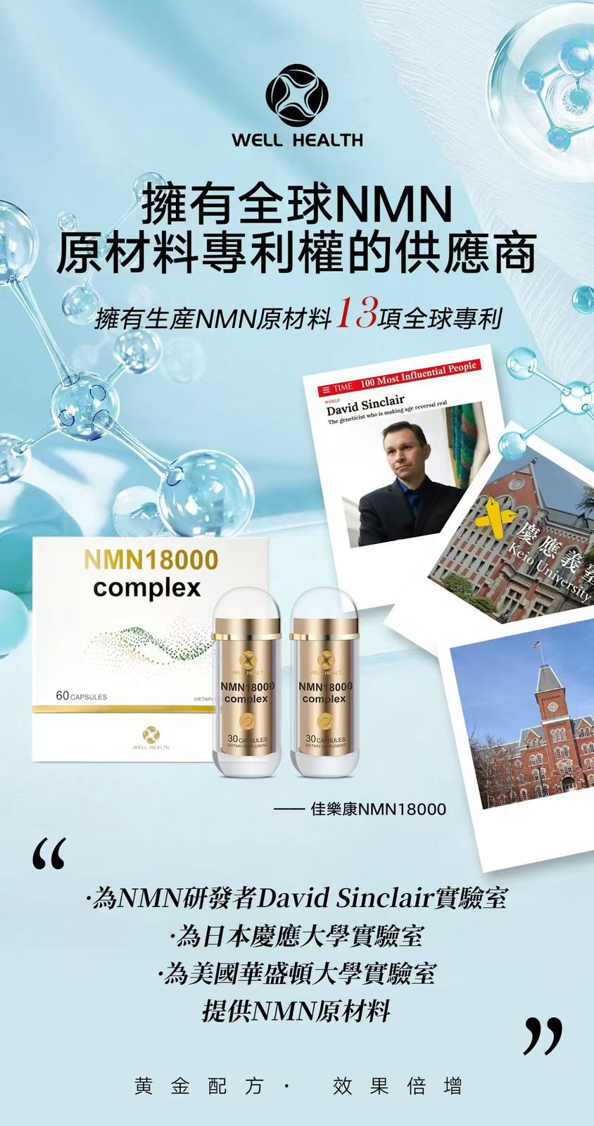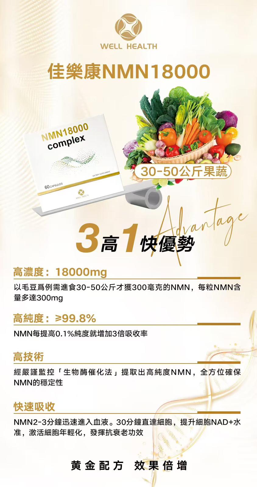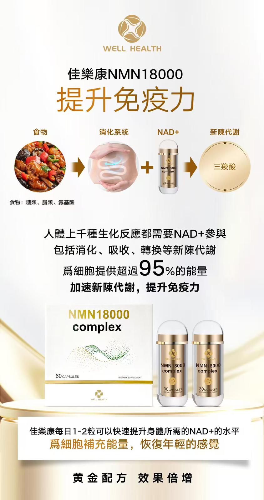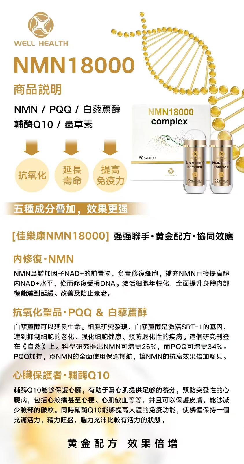 Well Health NMN 18000 Complex 產品規格: 60粒/盒 (買1送1) 商品介紹: Well Health佳樂康 NMN 18000 Complex 黃金配方